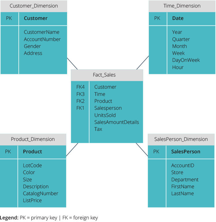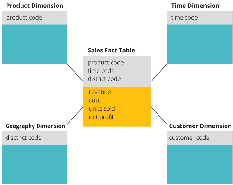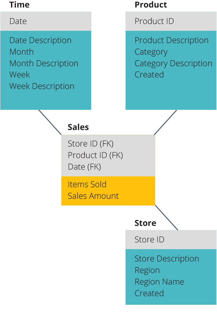 - Data warehouse schema: Defines the structure of the data warehouse—how fact tables are split into dimension tables